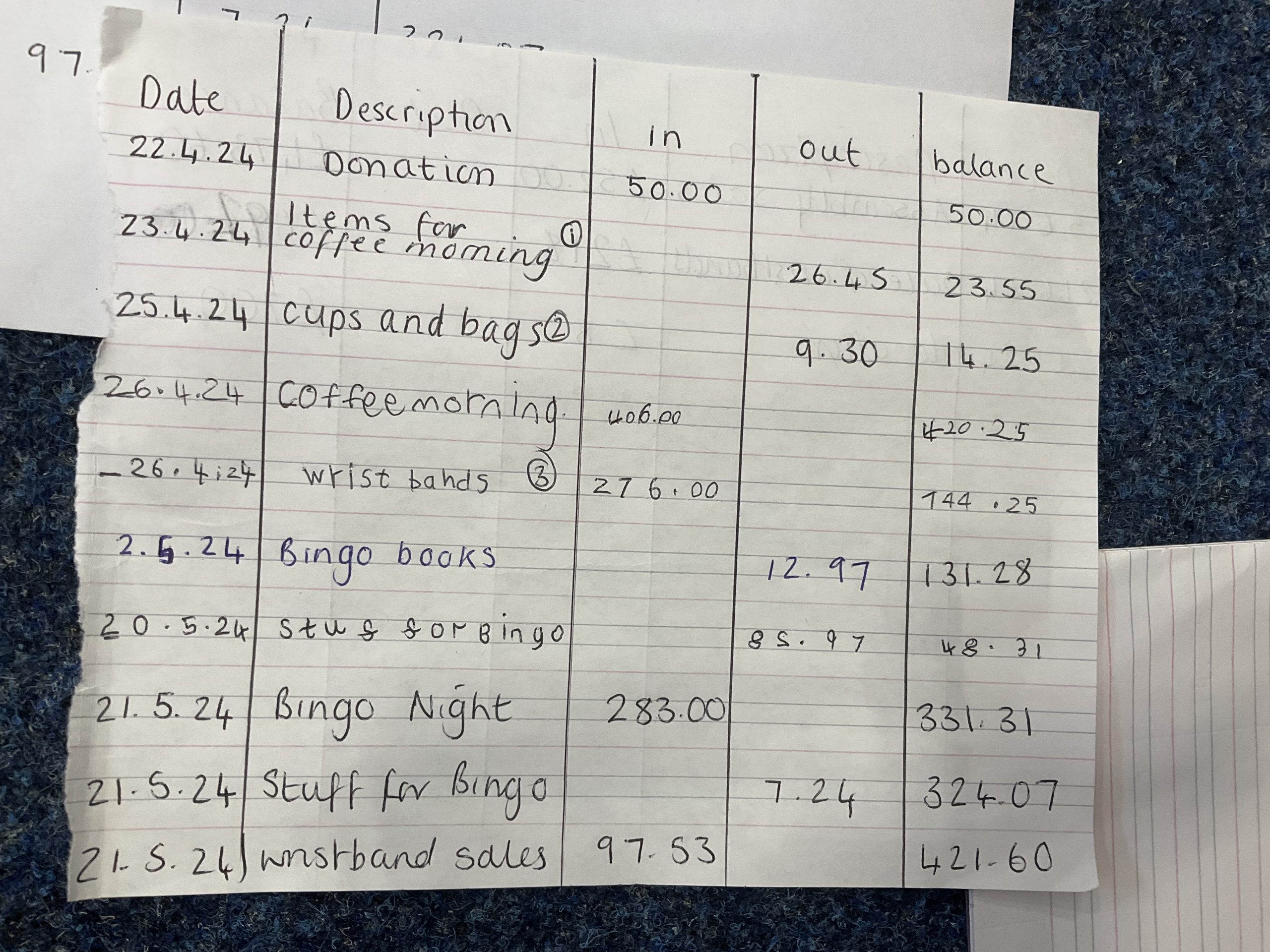 We have had a delivery of our bingo cards and products to sell. We have kept our accounts book up to date.