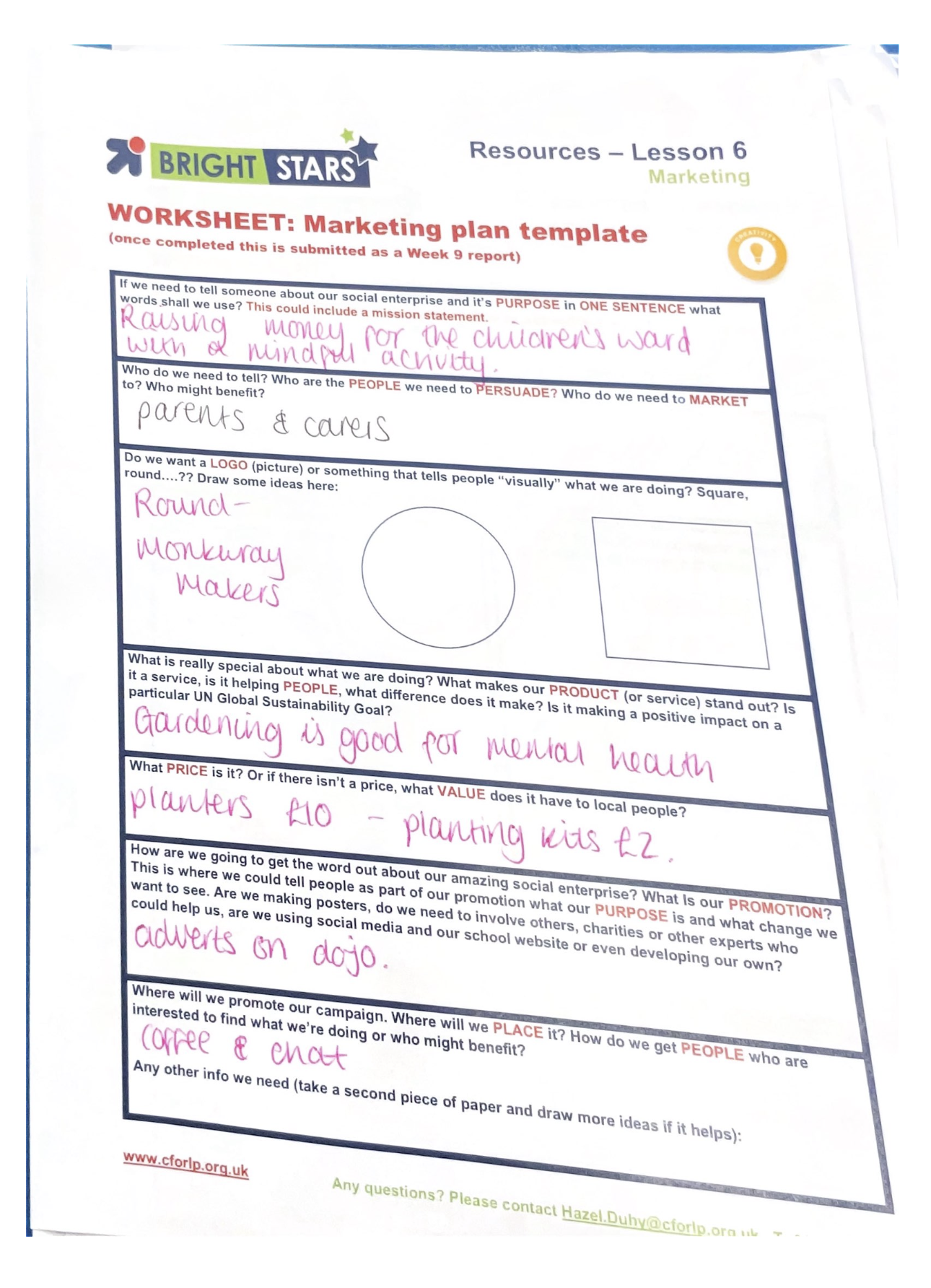 We have had Marc from No Name Travel in supporting us today and he helped by proof reading our letters, and looking over our logo designs and assigning team roles. Marc also helped us with giving charity suggestions.